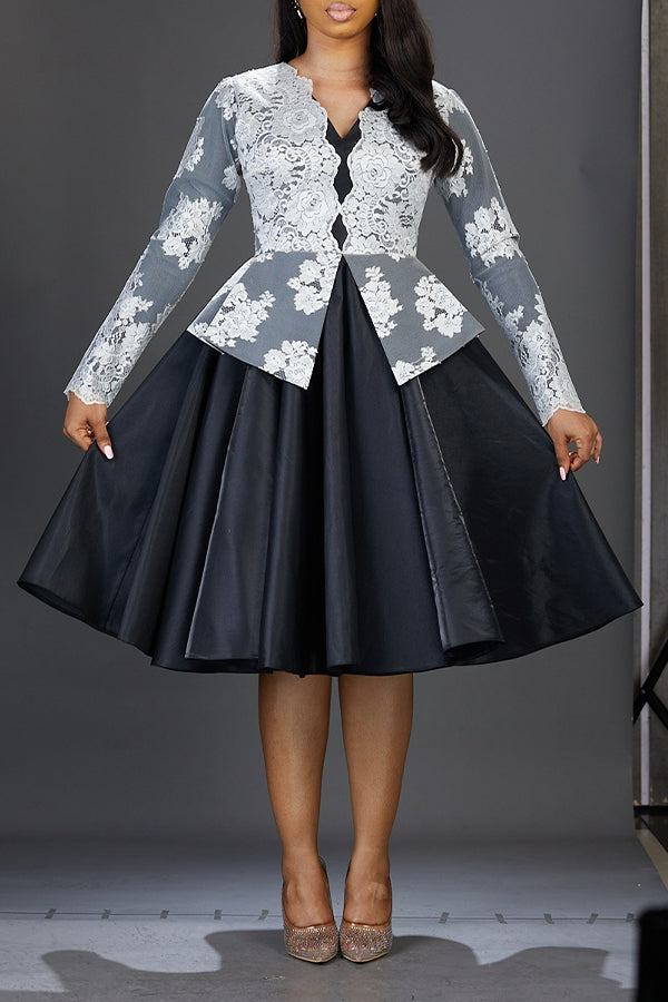 Stay on trend this season in our new elegant, v neck dress. We especially love the patchwork fabric and think this piece will be a new favorite in your closet!